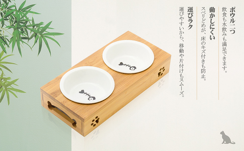 犬猫兼用 天然竹製スタンド 可愛いダブル陶器ボウル付き食器台